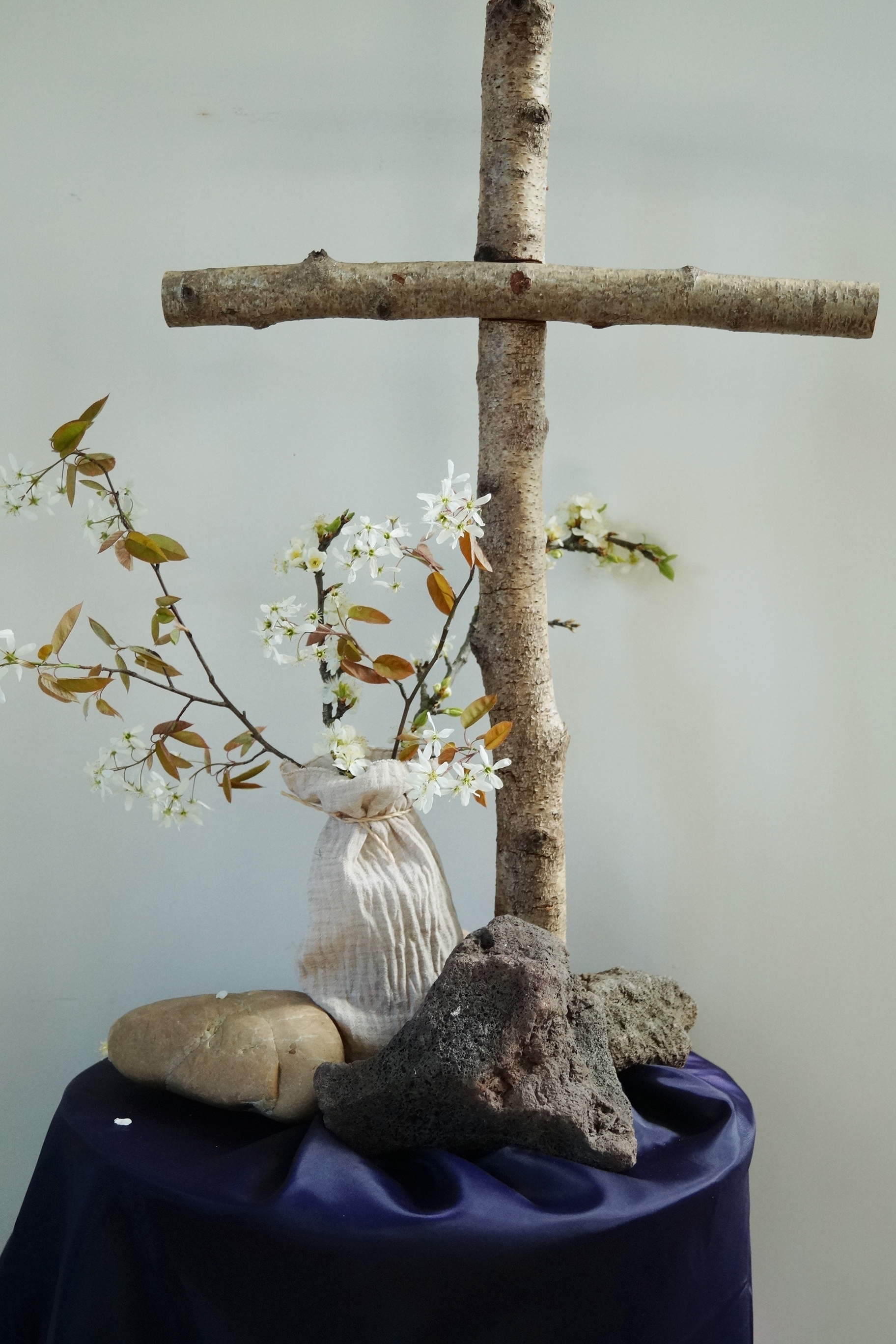 Basissymboliek VeertigdagentijdEen halve bolvorm staat symbool voor de aarde. Vanaf het begin van de Veertigdagentijd is het kruis aanwezig in de schikking. Het kruis is een directe verwijzing naar de genade van het geloof en naar de sterfelijkheid van de mens.