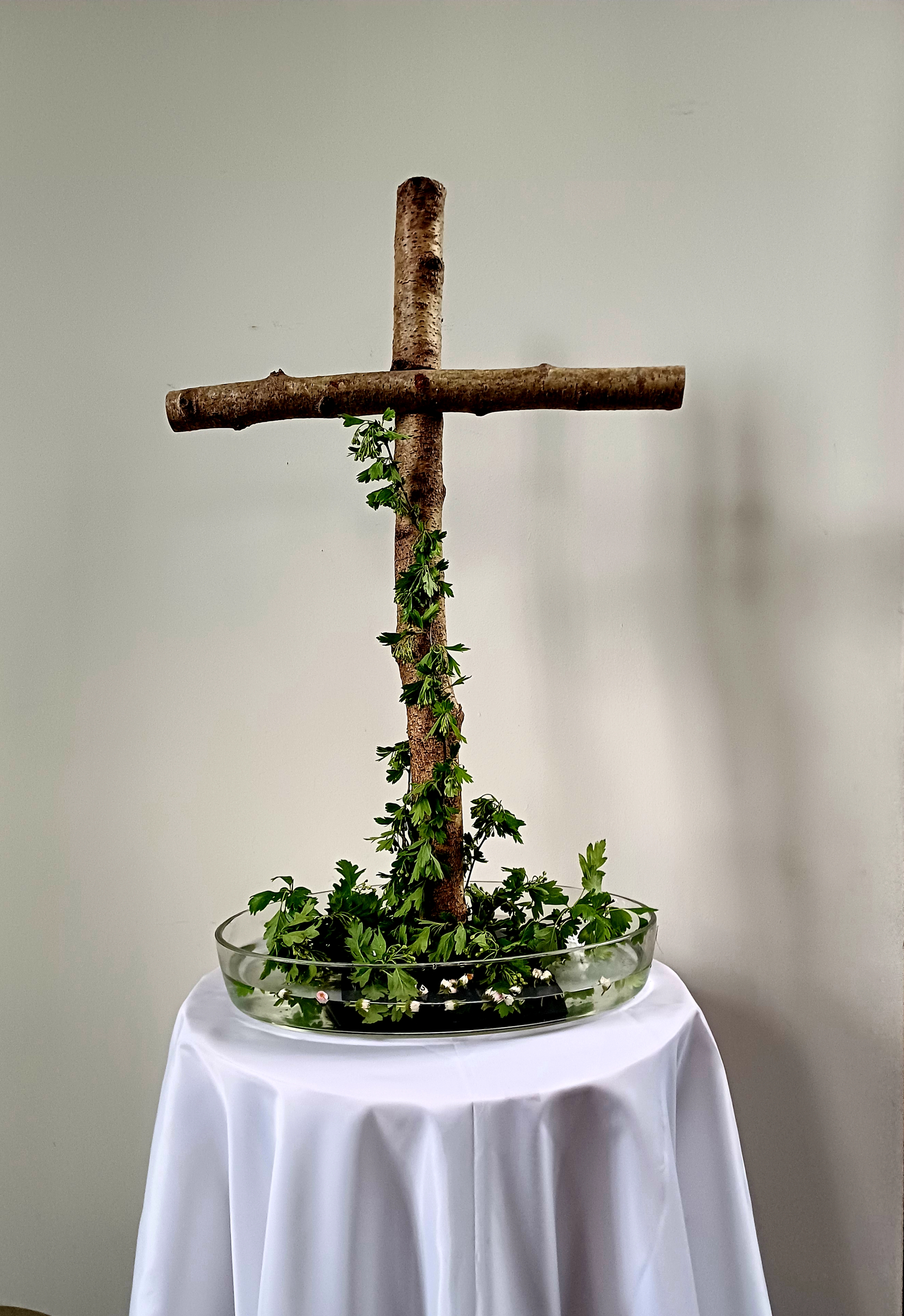 In de schikking van vandaag ziet u het kruis schuin naar boven, met daarop de rode takken van de Kornoelje. Zij symboliseren de verbinding met het goddelijke. De takken van de groene Kornoelje symboliseren de verbinding met het leven op aarde. Groen is de kleur van de toekomst. De groene en rode takken gezamenlijk symboliseren de tweesprong.
