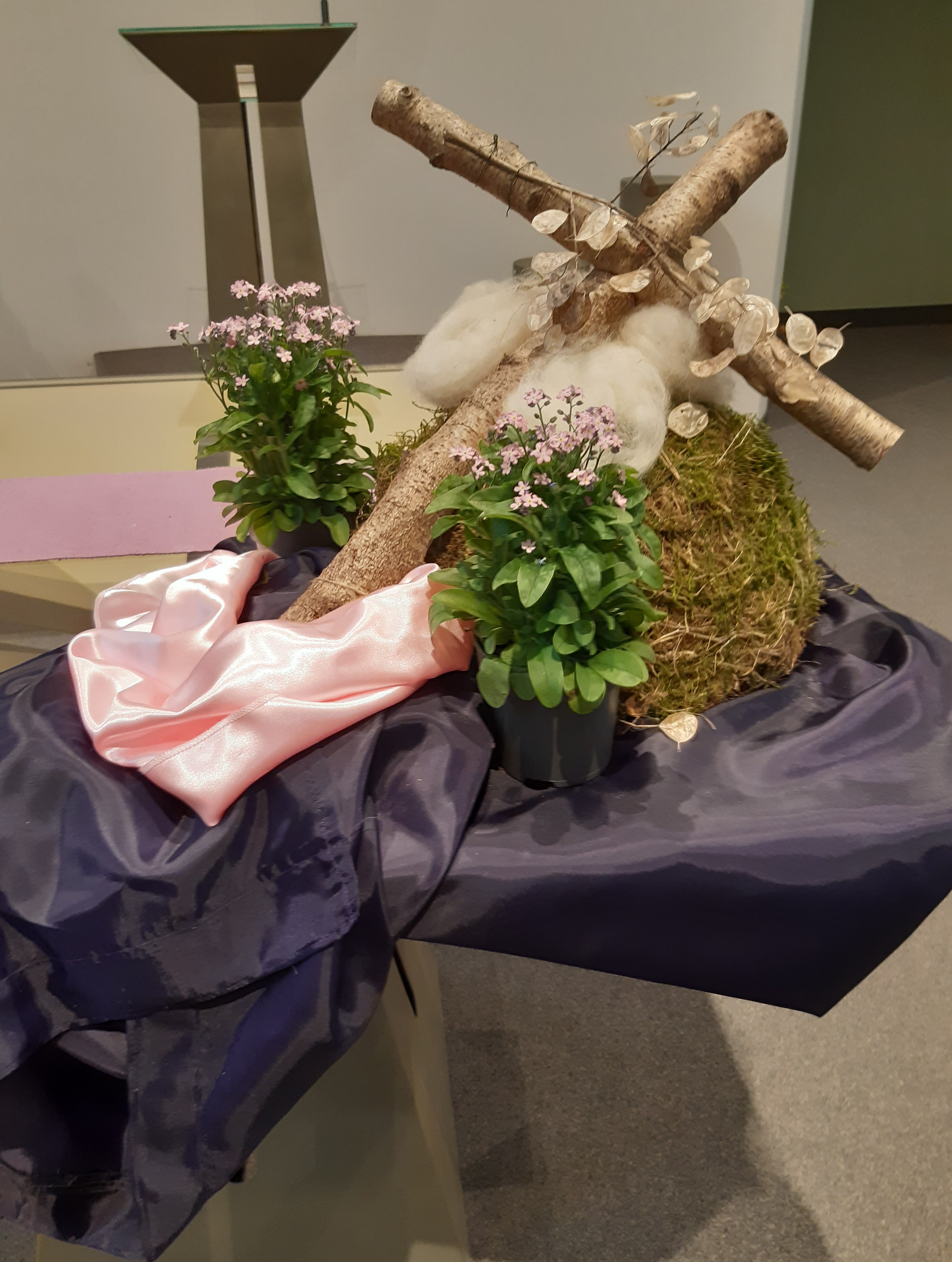 De roze doek in deze schikking wijst erop dat het licht al een beetje doorbreekt.