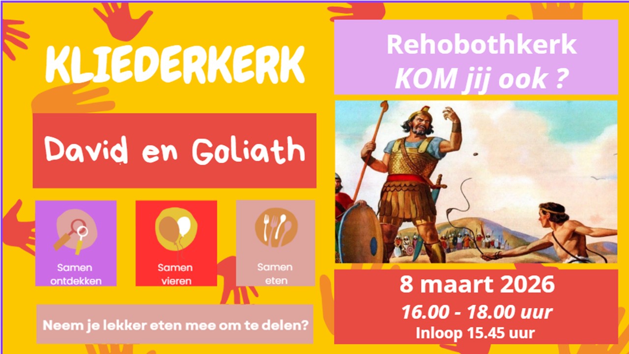 Op zondagmiddag 8 maart is er weer een Kliederkerk. Deze keer in de Rehobothkerk. Inloop vanaf 15.45 uur; het programma start om 16.00 uur en duurt tot 18.00 uur (inclusief maaltijd).
