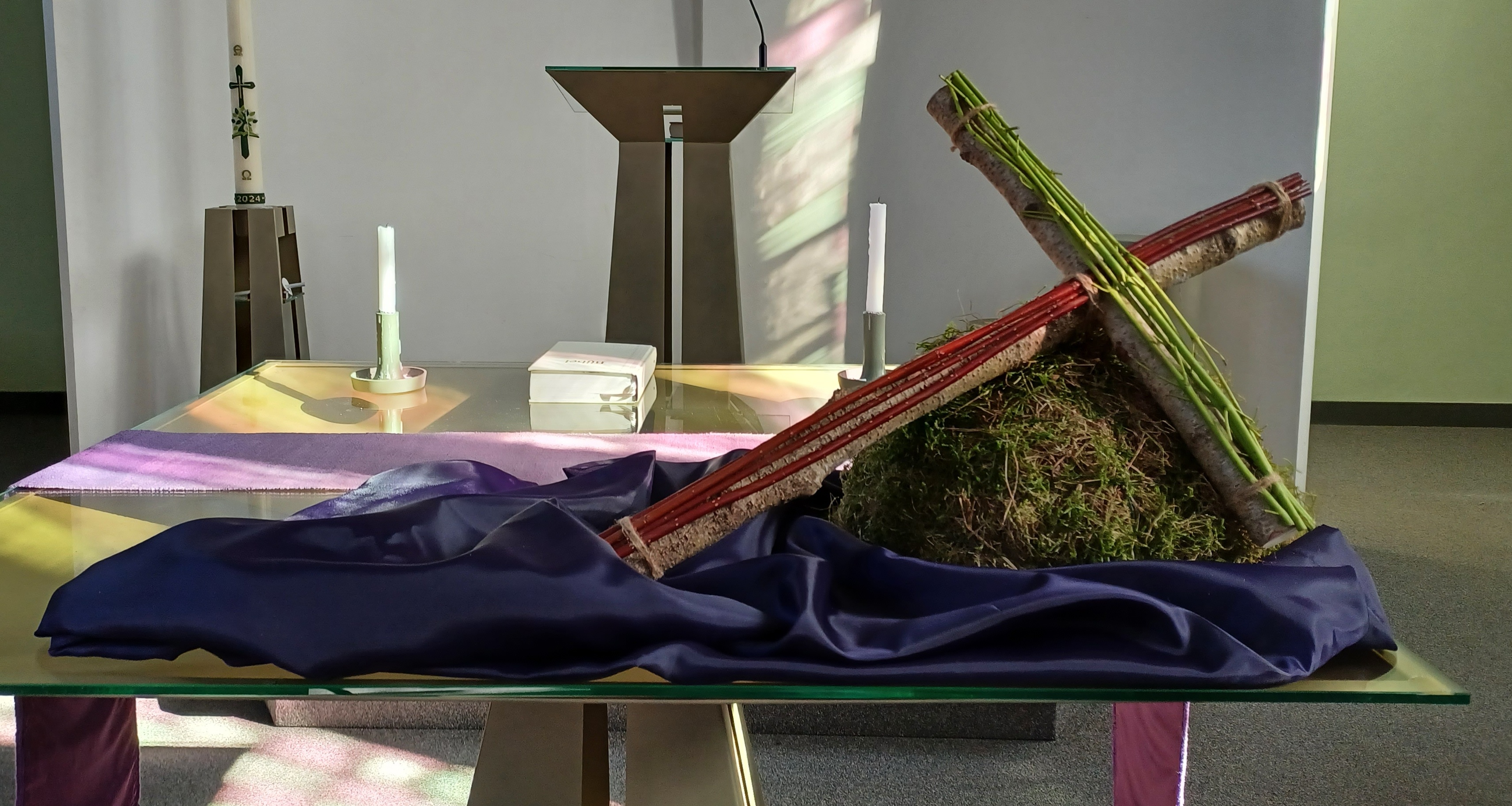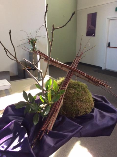 Basissymboliek VeertigdagentijdEen halve bolvorm staat symbool voor de aarde. Vanaf het begin van de Veertigdagentijd is het kruis aanwezig in de schikking. Het kruis is een directe verwijzing naar de genade van het geloof en naar de sterfelijkheid van de mens.
