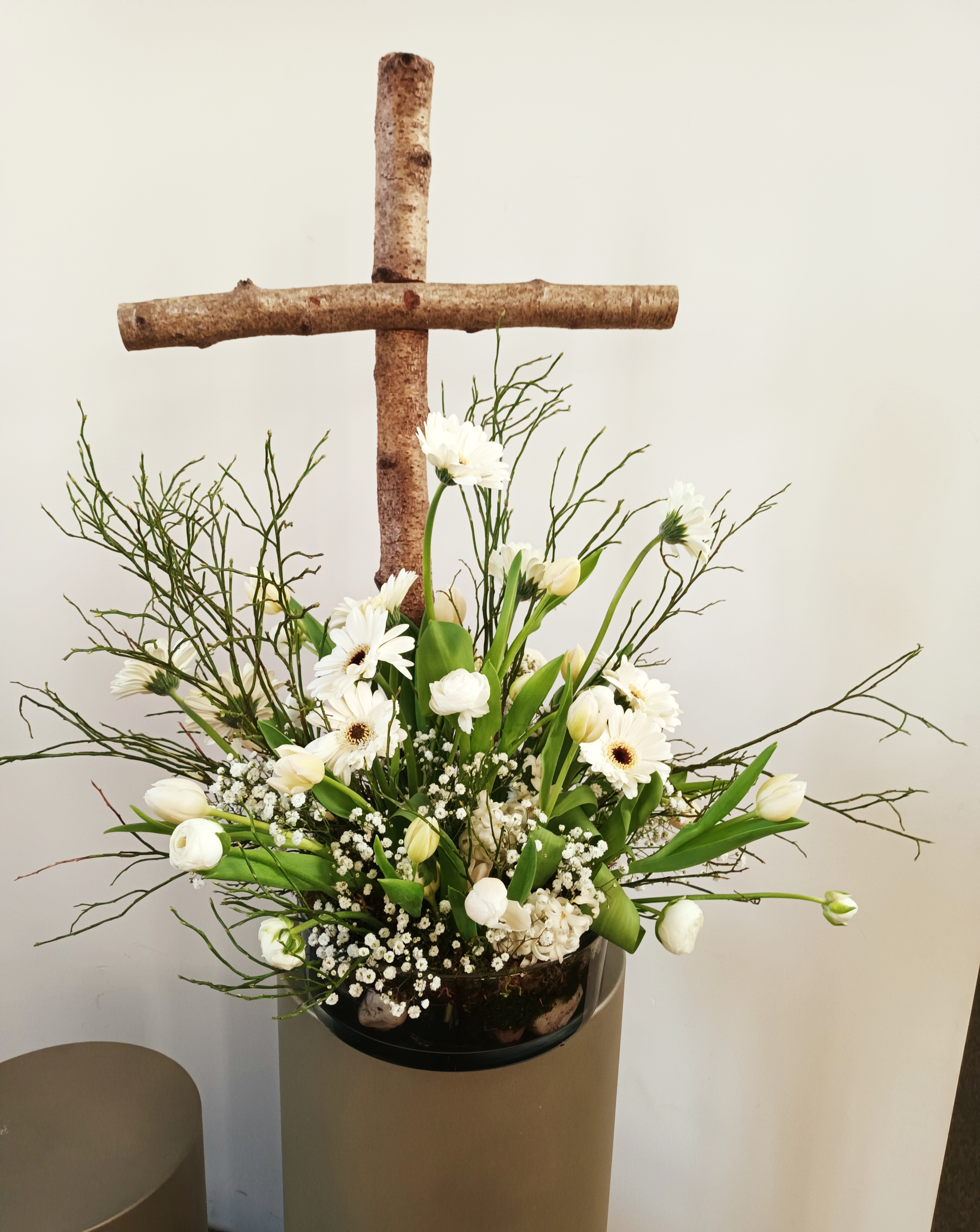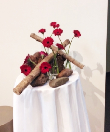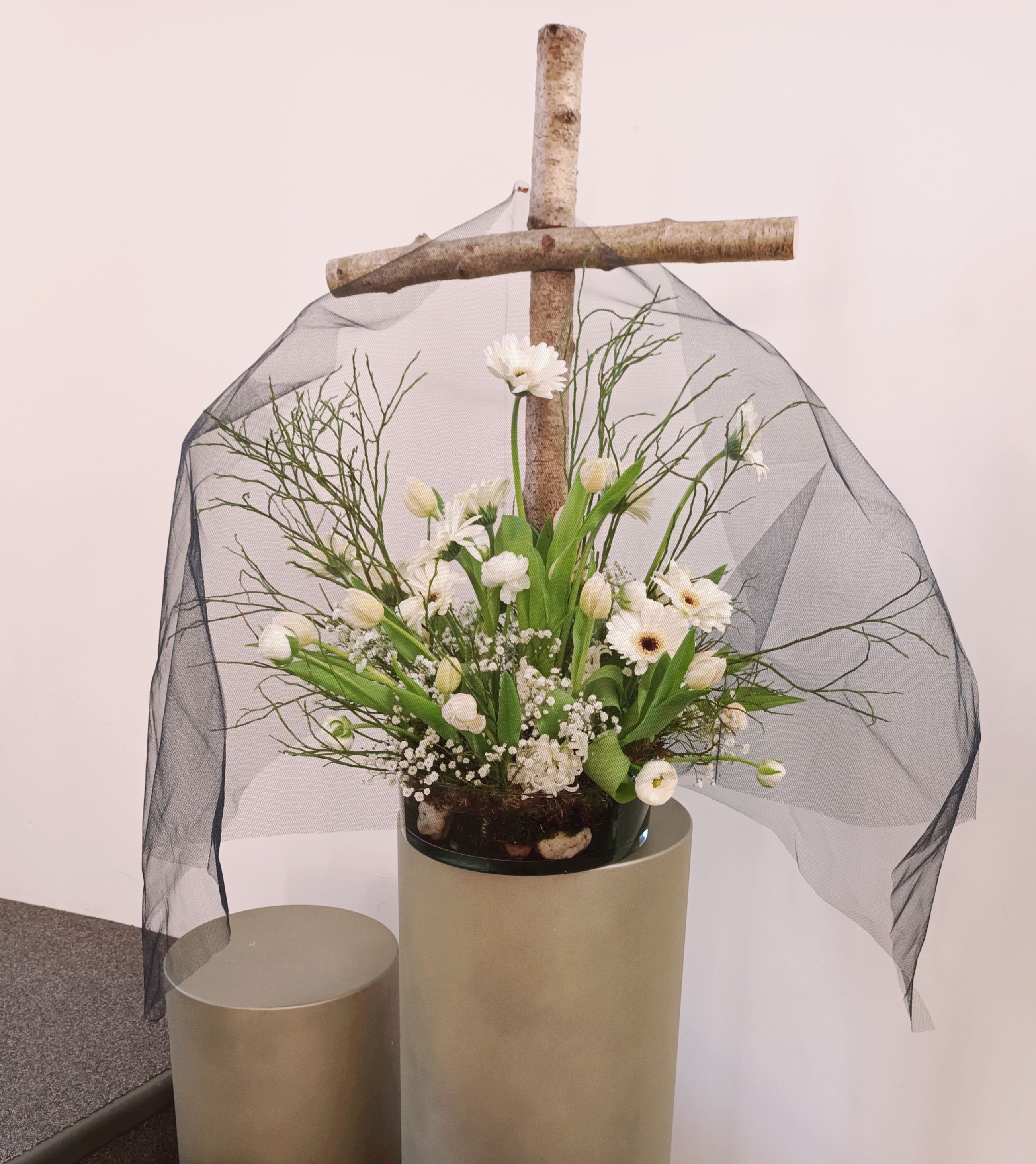 In de schikking van vandaag ziet u het kruis schuin naar boven, met daarop de rode takken van de Kornoelje. Zij symboliseren de verbinding met het goddelijke. De takken van de groene Kornoelje symboliseren de verbinding met het leven op aarde. Groen is de kleur van de toekomst. De groene en rode takken gezamenlijk symboliseren de tweesprong.